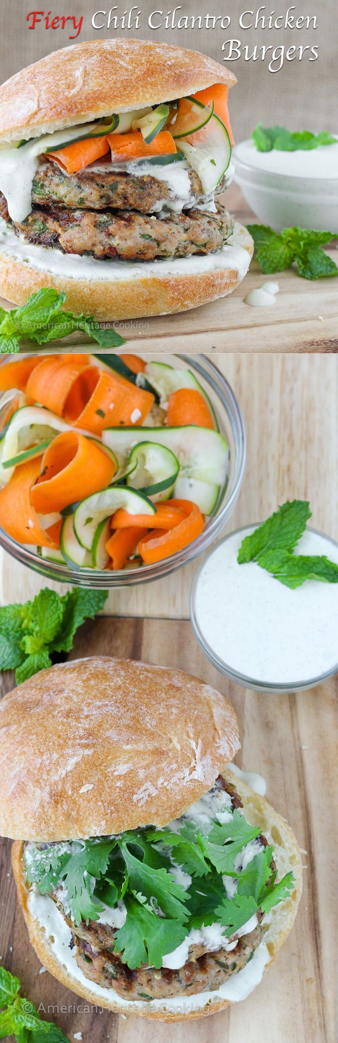 These fiery chili chicken burgers are seasoned with roasted red chili paste, garlic and cilantro! Served with a cool mint lemon yogurt sauce they make a perfect fast, easy and healthy meal! ~American Heritage Cooking #healthy #fast #dinner #lowfat #chicken #sauce #grill