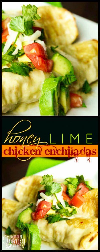 These Honey Lime Chicken Enchiladas are loaded with slow cooked shredded honey lime chicken and melty Monterey jack cheese and smothered in enchilada sauce. via Favorite Family Recipes