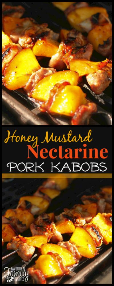 These Honey Mustard Nectarine Pork Kabobs are perfect for summer grilling! The sweet nectarines are a perfect match with the honey mustard marinated pork. via Favorite Family Recipes