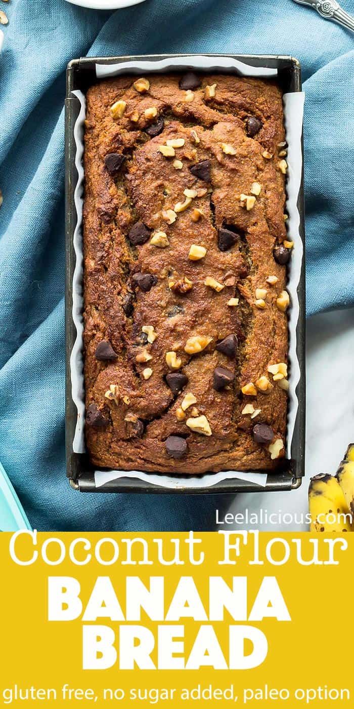 This amazing healthy Coconut Flour Banana Bread Recipe is gluten free and only sweetened with bananas (no added sugar). This banana loaf can also be made paleo and tree nut free. An easy one-bowl recipe that can be made with kids. #recipes #dessert #bananabread #coconutflour #glutenfree #walnuts #baking #nosugaradded #paleo #cleaneating Best | Simple | Cinnamon | Fun | Families