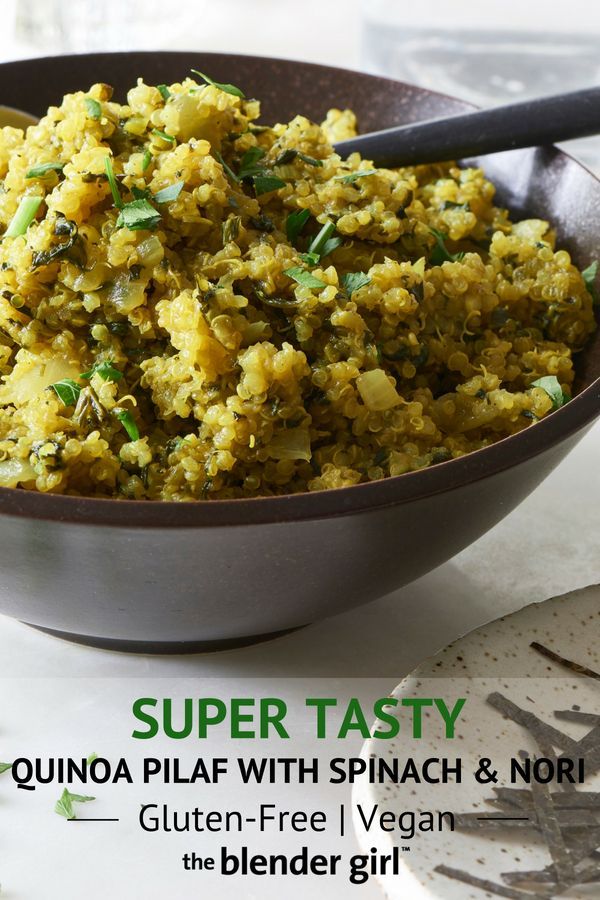 This quinoa pilaf with spinach and nori is one of my go-to vegan side dishes. You can make this quinoa pilaf with millet or brown rice with the same broth ratios. I often eat this quinoa pilaf for an afternoon snack, but it’s great served with stir-fried veggies. #veganquinoapilafrecipe #vegansidedish