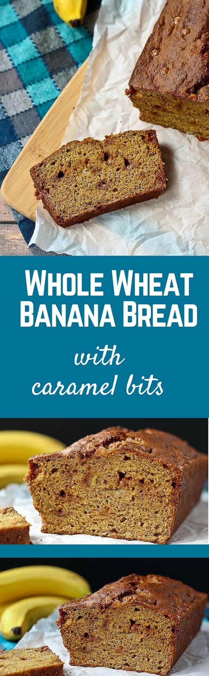 This whole wheat banana bread uses very little oil and 100% whole wheat flour. The caramel bits add the perfect touch of sweetness. Get the easy quick bread recipe on RachelCooks.com!