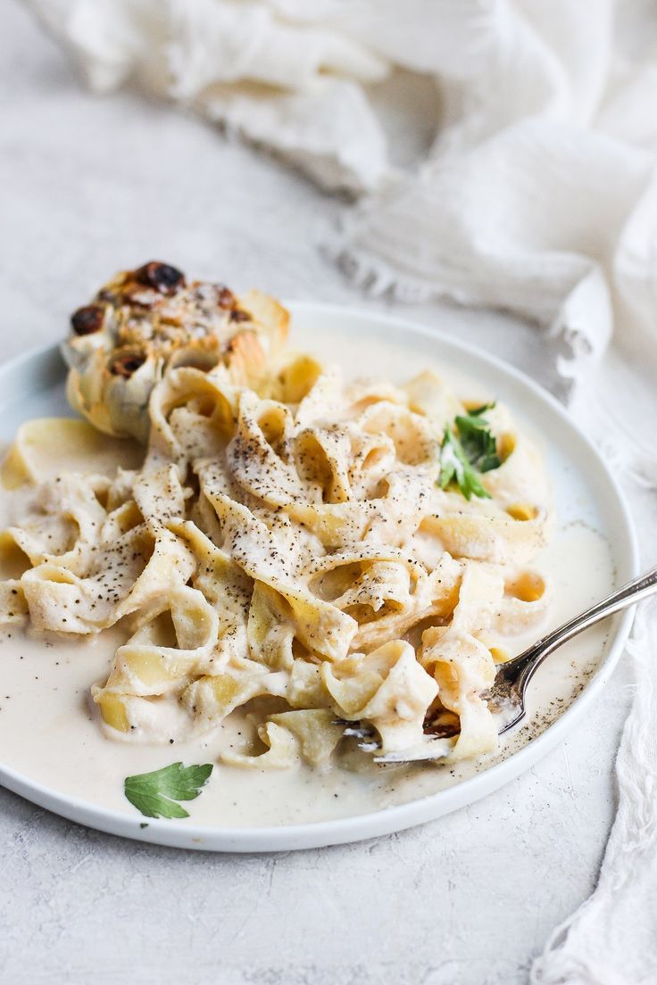 Vegan Roasted Garlic Alfredo Sauce – a silky and delicious vegan/dairy-free sauce that goes perfectly with pasta or spaghetti squash! #whole30 #vegan #dairyfree #healthyalfredosauce #homemadealfredosauce #whole30sauce #dairyfreealfredo #spaghettisquash #pastasauce