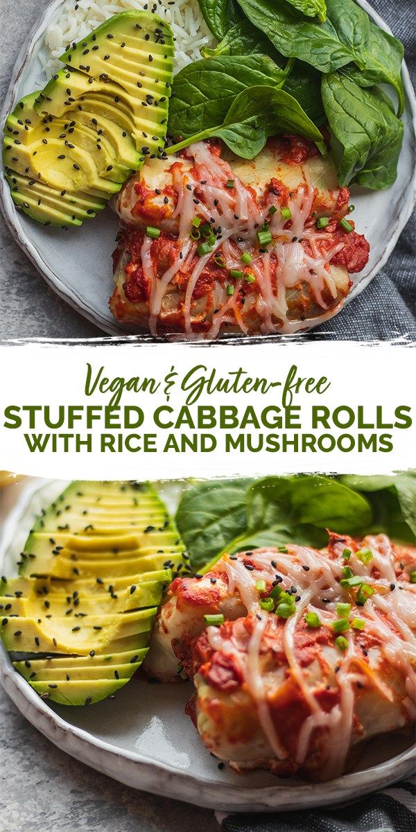 Vegan stuffed cabbage rolls with rice, mushrooms and vegetables, and an easy tomato sauce! This healthy recipe, which requires just wholesome plantbased ingredients, is great for a weeknight dinner or as an appetizer or starter for special occasions. Gluten-free and oil-free. #veganrecipes #stuffedcabbagerolls #vegancabbagerolls #vegandinner #easyveganrecipes