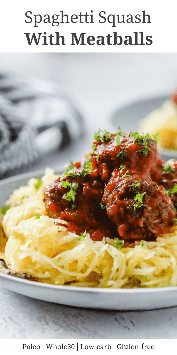 With this Whole30 Low-Carb Spaghetti Squash With Meatballs, you can reduce the carbs by replacing traditional spaghetti for spaghetti squash. One of our favourite healthy comfort food dinners that is served with homemade tomato sauce. #spaghettisquashwithmeatballs #lowcarbmeatballs