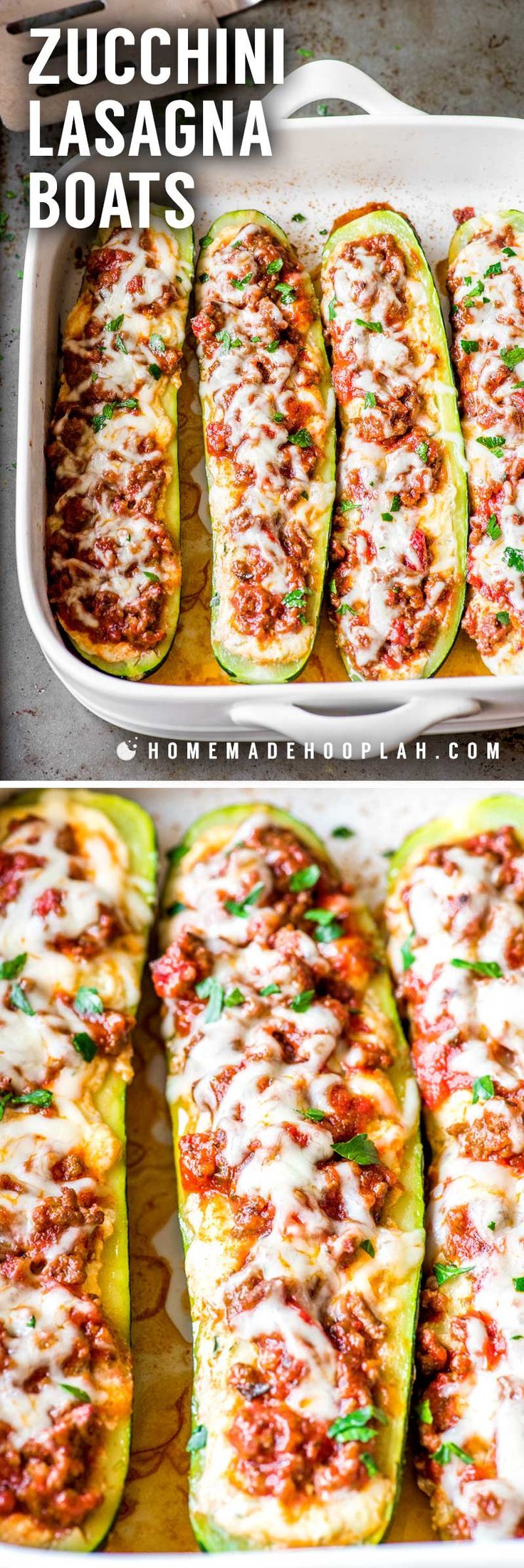 Zucchini Lasagna Boats! Tender baked zucchini filled with a mix of flavorful cheeses and topped with a meaty Ragu sauce. Plus, it’s easy to adjust the serving amount of this recipe to fit any time, date, or occasion! #AD #SimmeredinTradition | HomemadeHooplah.com
