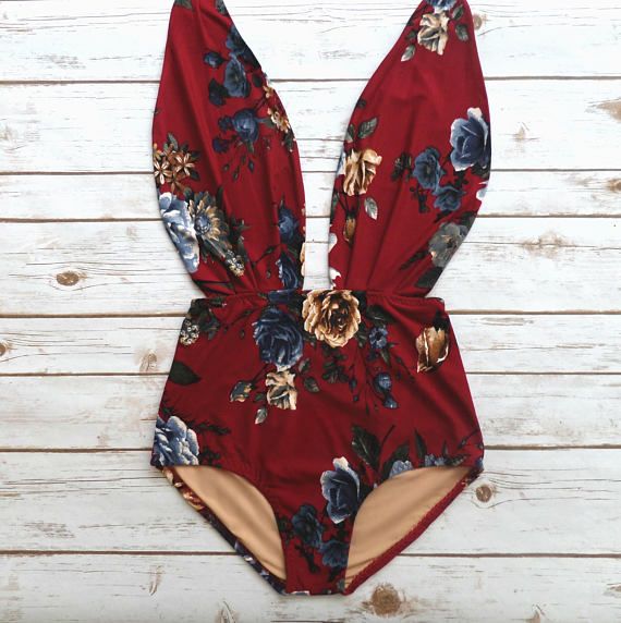 ❤ High Waisted One Piece Swimsuit – Handmade in a Vintage Inspired Design – This is Such a Figure Flattering Swimming Costume! ❤ ❤ In Beautiful Burgundy Red, Blue and Cream Vintage Floral Print ❤ ❤ Stunning Plunge Design Bathing Suit ❤ This swimsuit is everything that swimwear should