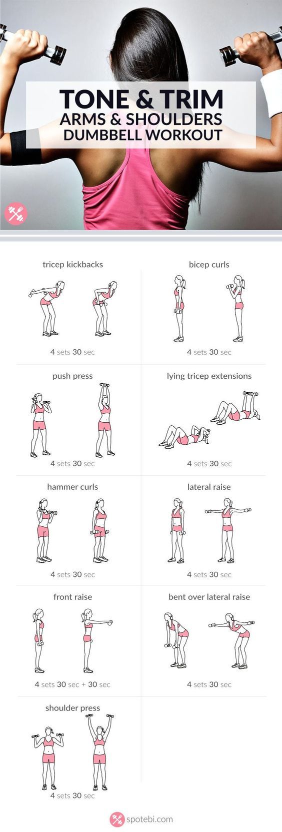 Arm & Shoulders Dumbbell Workout. Each exercises for 30 sec or complete 15-20 repetitions. Rest 30-60 sec, repeat circuit 4 times. Total of 20 mins